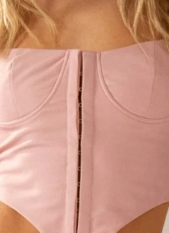 Girl, you’re about to go viral! Our super sexy Maggie Bustier is a cropped length bustier cut in a v-shape with hook and eye closure down the front with underwire cup detailing. Made in our lovers pink tone and handpicked for date night.