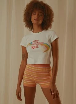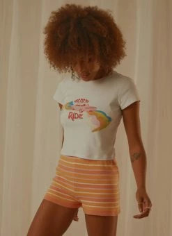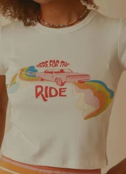 We’re feeling all the retro vibes and we’re here for the ride! The Here For The Ride Slim Tee is a 90’s style baby tee with. groovy printed graphic. A staple for your weekend wardrobe!