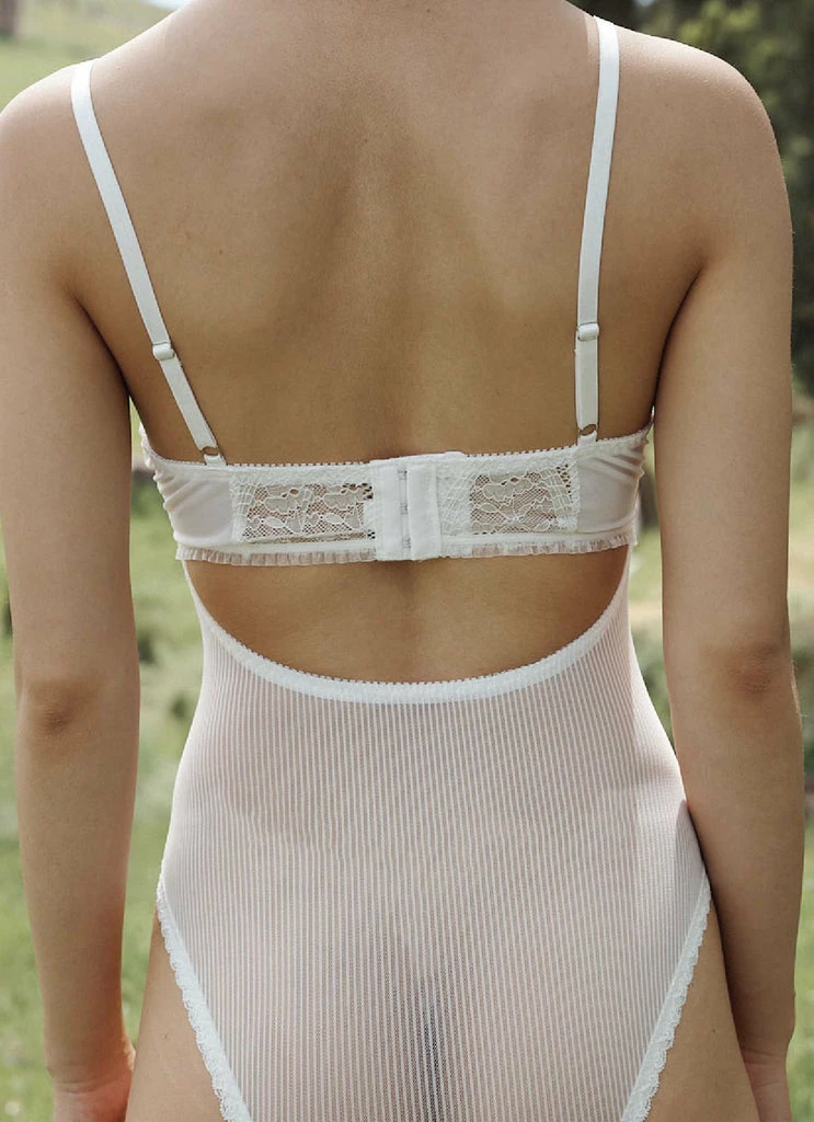 With lined cups for modesty, this bodysuit boasts signature Kat design elements across a cut out back, intricate scalloped lace details, super stretch striped mesh and an open close press stud gusset. Pair her with your favourite jeans for an exposed lingerie look