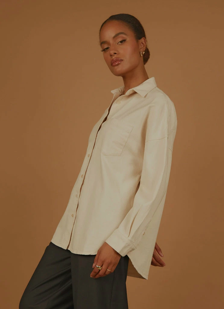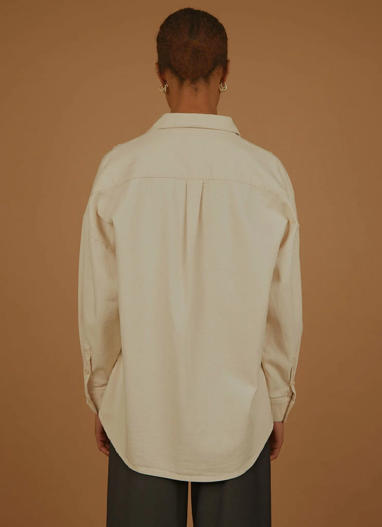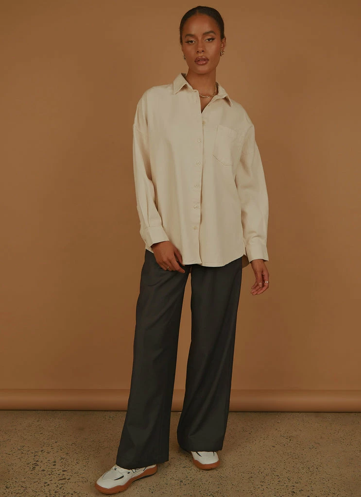 An everyday essential! Constructed in 100% heavyweight cotton twill, the Denver Shirt is a relaxed, slightly oversized fit with a scalloped hem sitting just below the hips. Classic shirting features include a collar with button front opening, front chest pocket and full length sleeves with cuff.