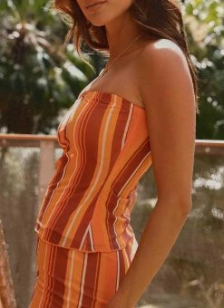 Keeping it funky fresh in the Afternoon Sun Bandeau Top. A cute little strapless crop top with soft mesh overlay and our exclusive Golden Hour Stripe print. Style is back with any bottoms or step up your retro game and pair it back with the Catching Last Light Pants.