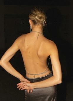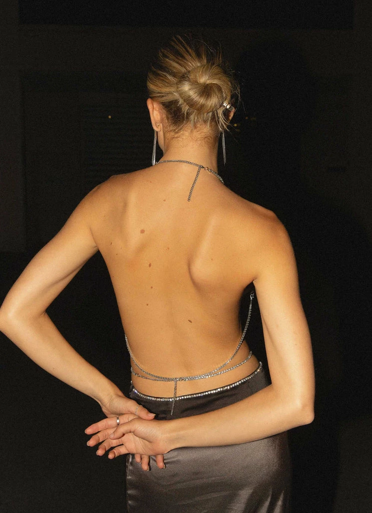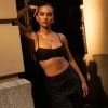 Irresistible and sexy in the Blind Love Crop Top. This strapless crop top has been crafted in silky black material with contrasting rhinestone straps that go across the shoulder blades. The perfect party set styled back with the Blind Love Maxi Skirt.
