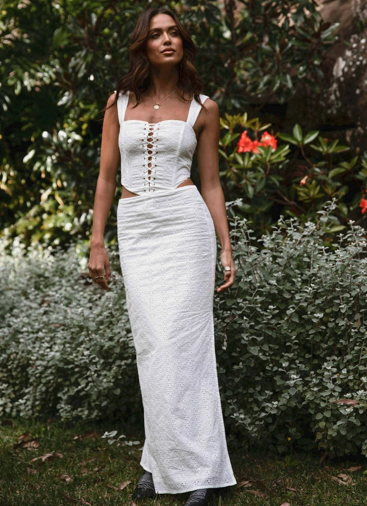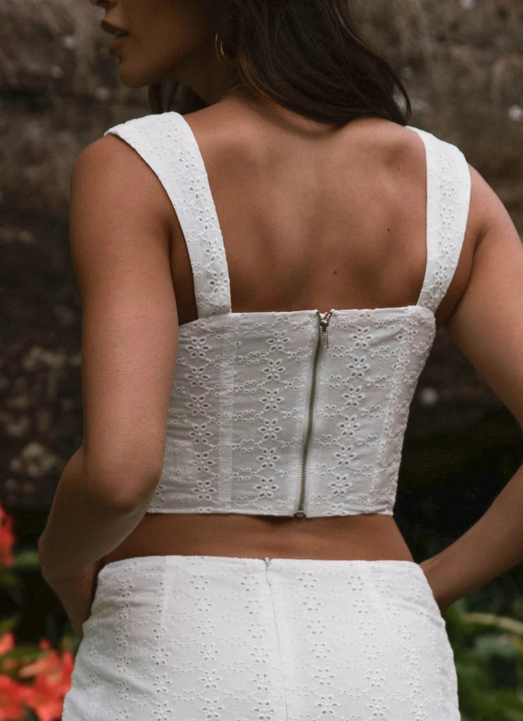 Sexy summer essential! The Good Luck Charm Bustier has been crafted in a light cotton with feminine broderie detailing featuring structured boning with lace up bodice and exposed zipper at the back.