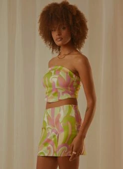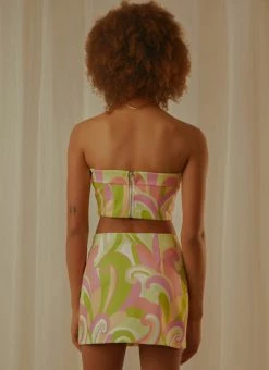 A 90’s vision! We’re all about the retro vibe rn. The Living In The 90s Bustier is a strapless, cropped style and features a groovy retro swirl print. We love it paired with the Euphoria Low Rise Mini Skirt to complete the set or a high rise jean and platform mule.