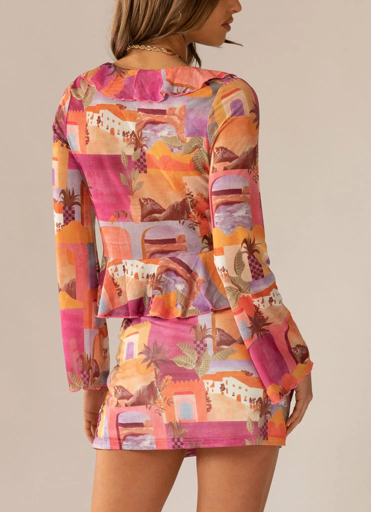 The perfect combination of sexy and cute! The Sweet and Sultry Tie Top is crafted in a soft mesh featuring our exclusive Sunset Building Print with a feminine fluted hem throughout. A simple finish, tie detailing between the bust with a frill v-neck.