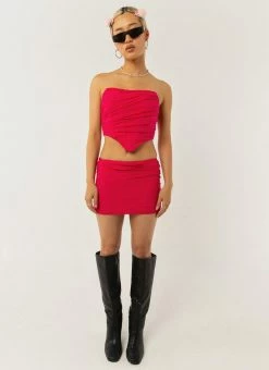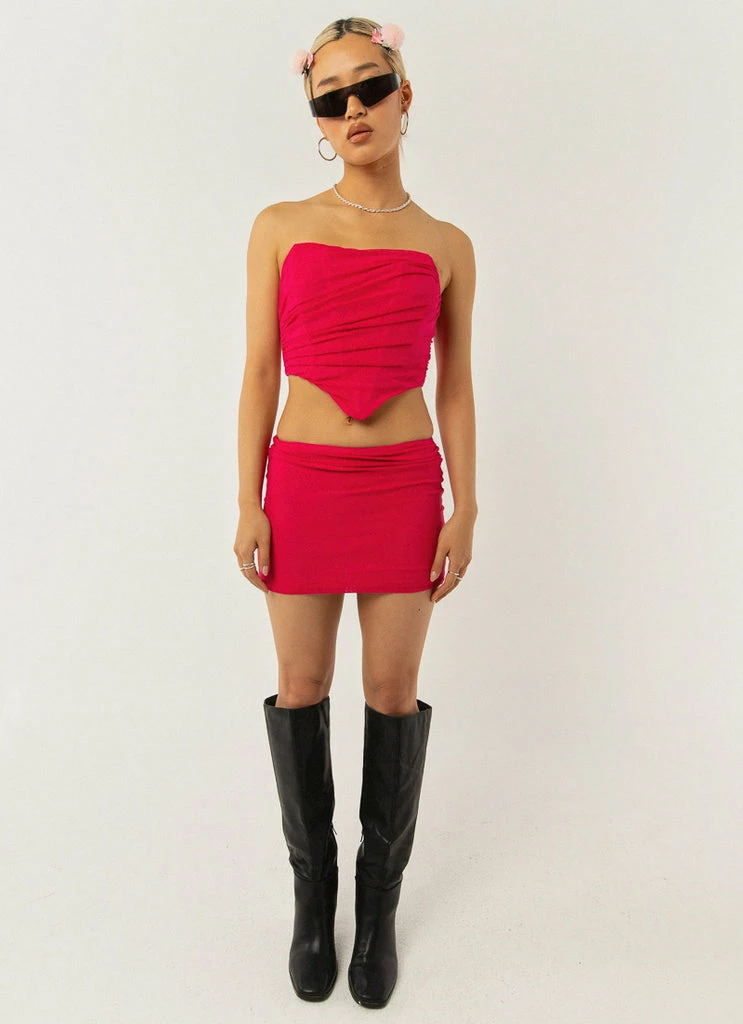 Pretty in pink! The Zenni Bustier Top is a deep v shape and has been crafted in soft mesh overlay in an eye catching magenta colour and features structured boning at the front with ruched detailing at the sides. Pretty in pink with the Hattie Mini Skirt and layered with the Sienna Mesh Halter Top.