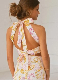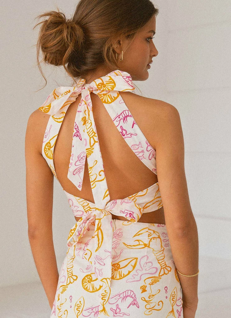 Date night ready with the Fresco Linen Halter Top. Crafted in crisp, light linen and featuring our exclusive Peppermayo x Rikki Day print with thick strap halterneck and open back detailing the crop top is sure to become your summer favourite. Simply styled with the Sicilian Linen Pants, strappy mules and chunky gold jewellery.