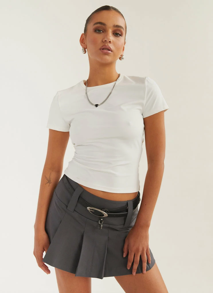 Elevate your basics wardrobe with the Solidify Me Baby Tee.? A smooth and comfortable fit, this tee is a nod to the 90?s in a cute baby tee cut. Crafted in a neutral tone, making it the perfect everyday wardrobe staple and layering piece.