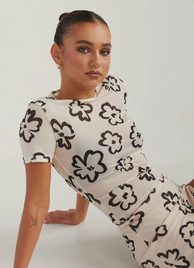 Keep it cute in the Structured Shapes Mesh Tee. A cropped, fitted tee crafted in soft mesh and featuring our exclusive Silk x Peppermayo floral motif.