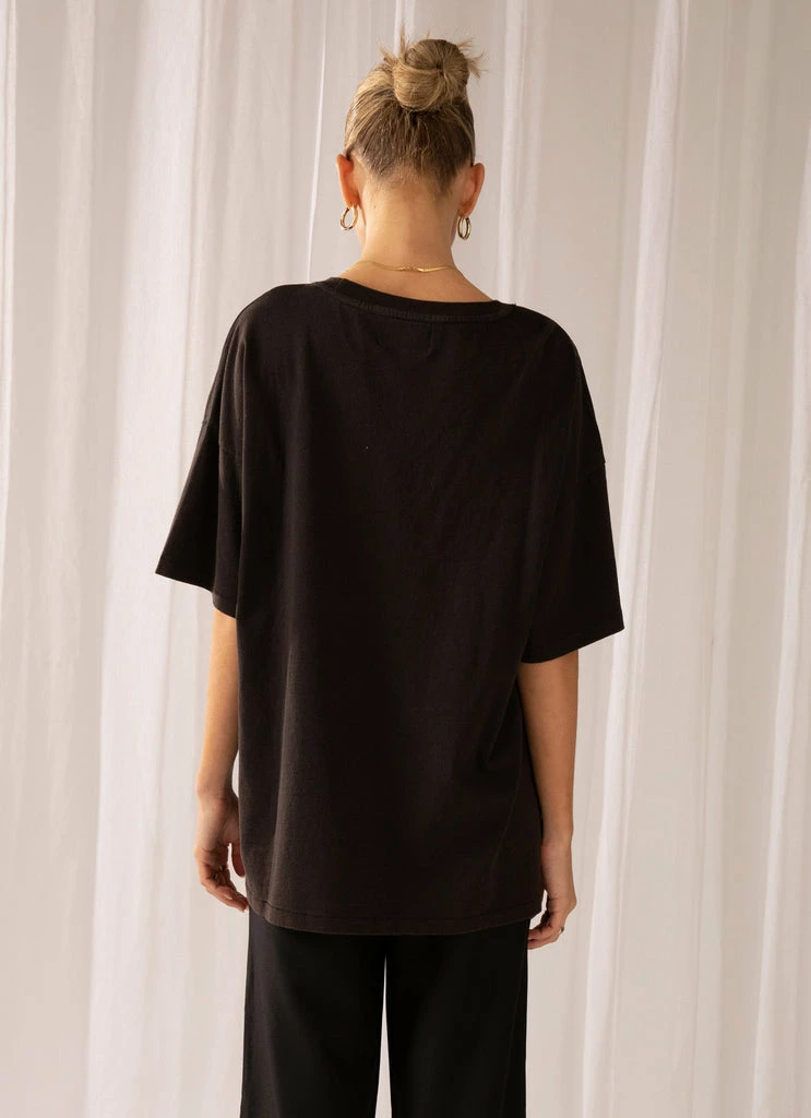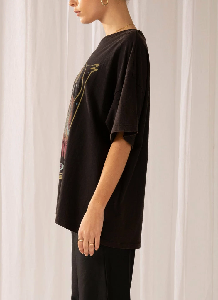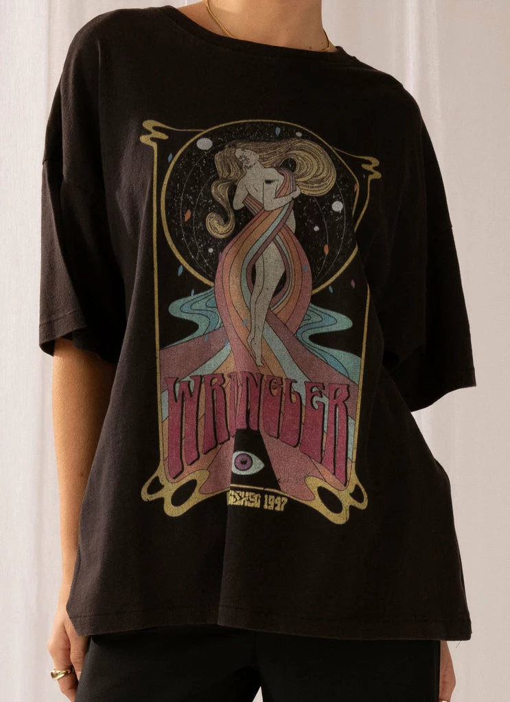 This super oversized fit tee is our biggest yet. This 90s skater inspired fit can be worn layered over long sleeve tees and skivvys, or even with nothing underneath as a dress. Featuring Wrangler original artwork print has been specially faded to appear already worn in for years.