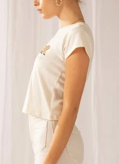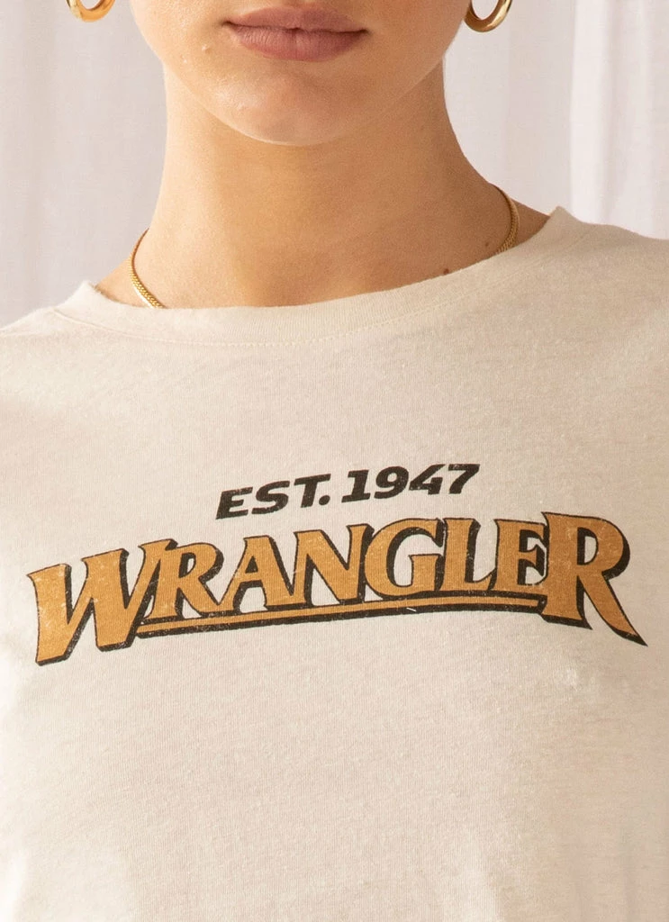 A fitted 90s inspired baby tee with a cropped waist and short capped sleeves. Featuring a worn vintage print inspired by road signs along Route 66. Perfect for winter road trips down the coast.